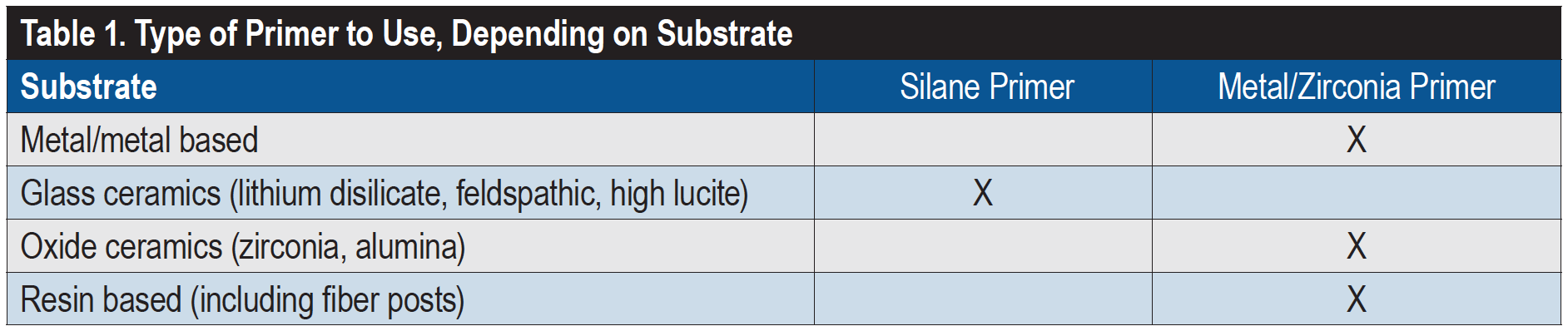 Treatment of the restoration: Adhesive resin cements also require treatment of the substrate that will be bonded to. Glass-based restorations should be treated with pure silane that is free of any additional primers or bonding agents,23 while all metal, composite, and oxide ceramics should be treated with a methacryloyloxydecyl dihydrogen phosphate (MDP)-containing metal/zirconia primer (Table 1). Assumptions should not be made regarding how a laboratory is pretreating restorations. The laboratory should be contacted to determine whether glass-based restorations have been etched with hydrofluoric acid and oxide ceramics have been sandblasted. If these steps have not taken place at the laboratory, they need to be done in-office.